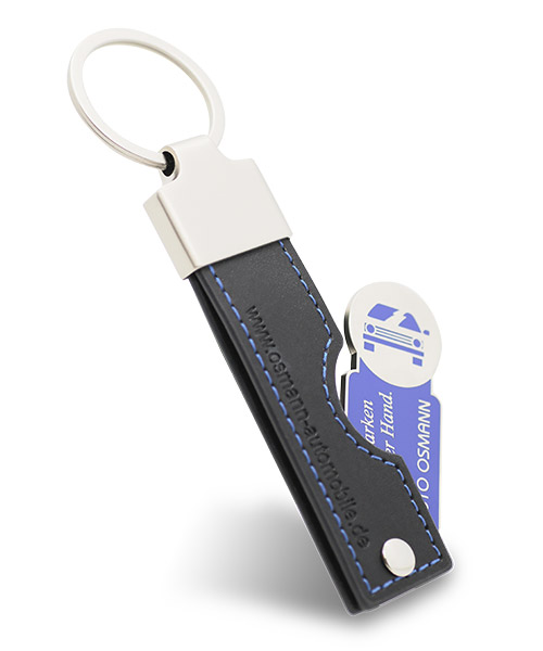 | Herstellung Leder- Schlüsselanhänger: | PU-Leder in schwarz, Leder mit blauer Ziernaht. Mit Blindprägung auf dem Lederband. Ohne Veredelung des Metallhalters. |